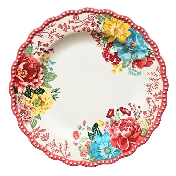 Bring warmth and charm to your table with this beautifully designed Pioneer Woman dinner plate, featuring a vibrant floral motif in rich reds, blues, and sunny yellows. Framed by a scalloped edge with delicate beaded detailing, this plate adds a cheerful, vintage-inspired touch to everyday meals and special gatherings alike.