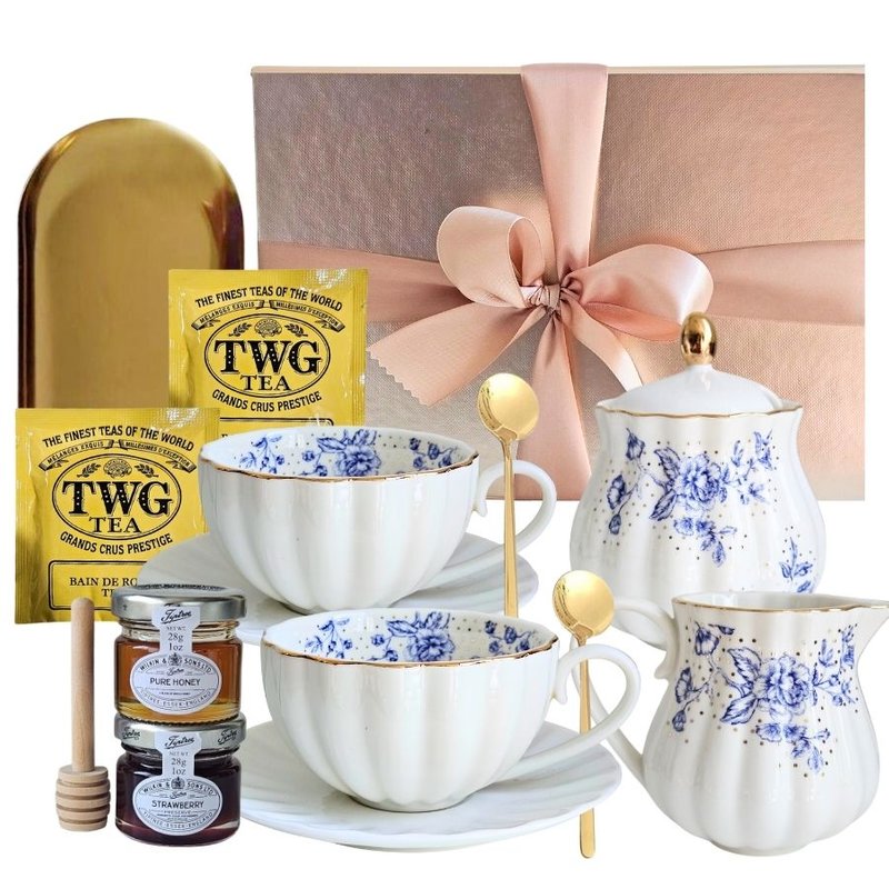 A refined tea-lover's dream. This elegant porcelain floral tea set paired with TWG blends and artisanal honey & jam transforms any afternoon into a luxurious ritual — perfect for housewarming, birthdays, clients, and heartfelt celebrations