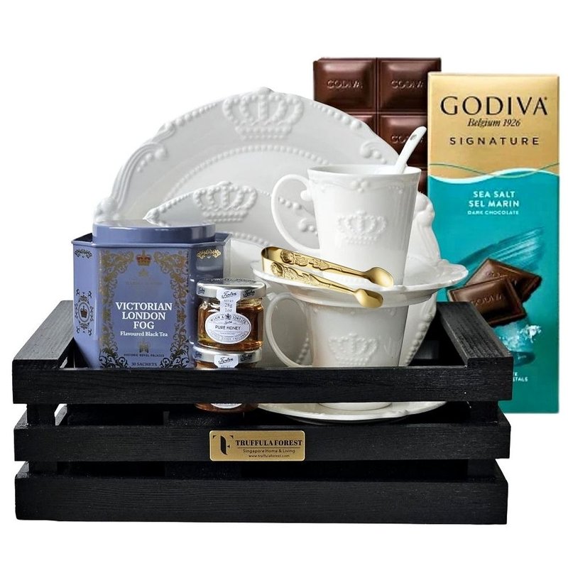 Sophisticated tea lover's gift set presented on an elegant black wooden crate tray. This curated hamper brings together premium essentials for a luxurious afternoon tea experience