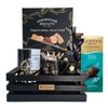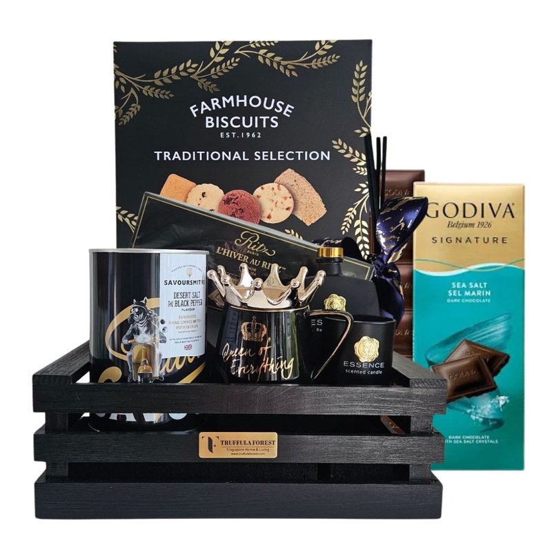 An elegant black & gold gift crate featuring gourmet treats, home fragrances, and a statement crown mug—perfect for birthdays, appreciation gifts, and corporate occasions.