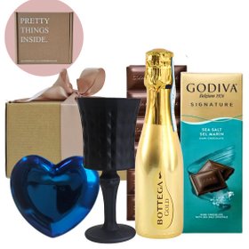 Celebrate love with this elegant set featuring a heart-shaped metallic gold dish, black goblet, premium chocolate, and sparkling gold Bottega mini wine – beautifully packaged for the perfect gift.