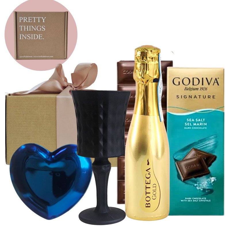 Celebrate love with this elegant set featuring a heart-shaped metallic blue dish, black goblet, premium chocolate, and sparkling gold Bottega mini wine – beautifully packaged for the perfect gift.